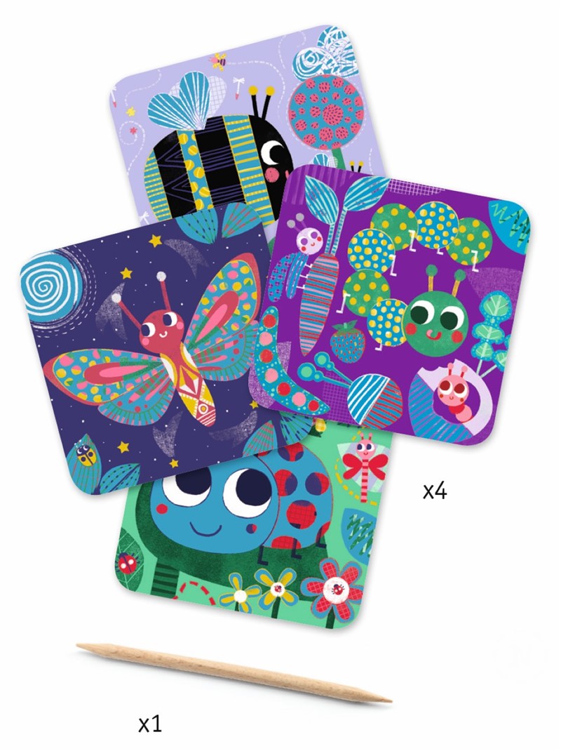 -4 tableros para rascar con un palo de punta redondeada, adecuados para los niños pequeños. Con el palo de madera y el folleto explicativo, el niño rasca la superficie de la tarjeta para hacer dibujos o descubrir sorpresas, ¡qué placer! Y aunque, llevado por su impulso, quiera rayarlo todo, el resultado también será bonito.