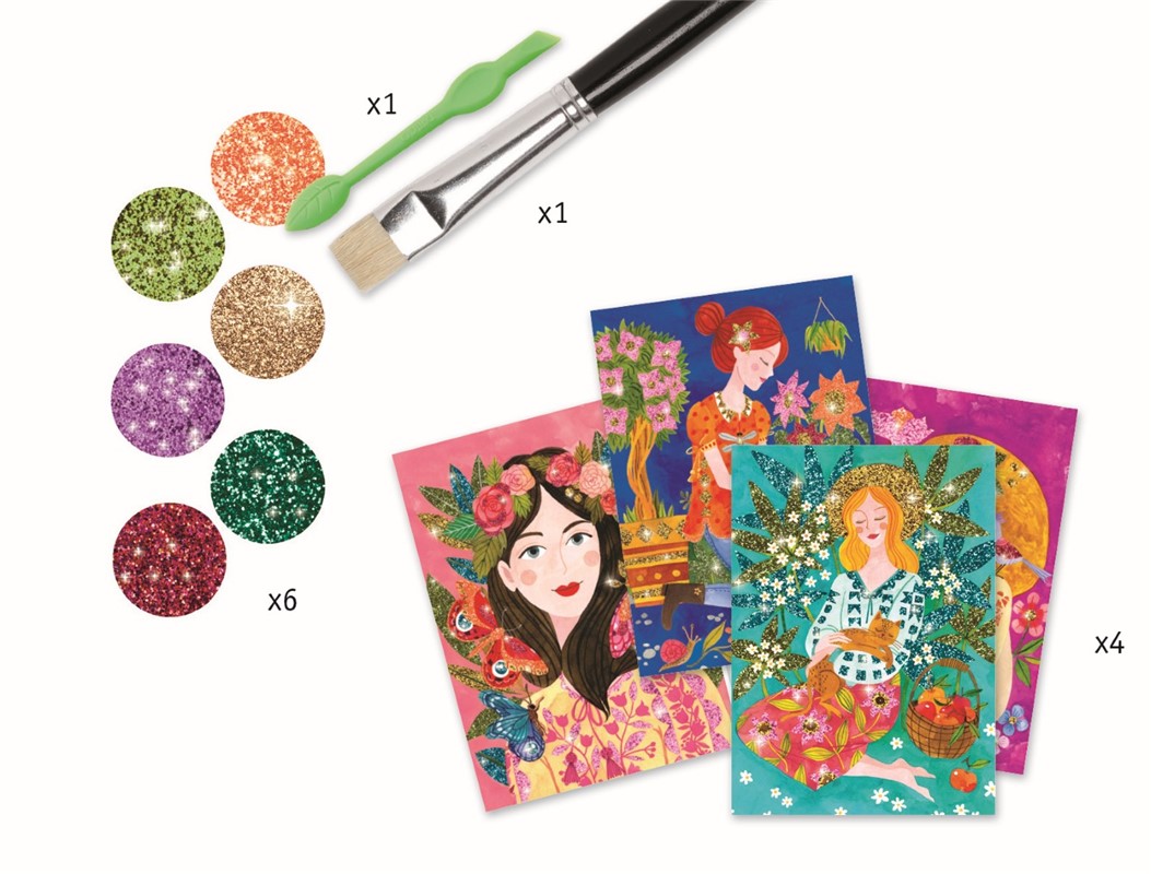 4 cuadros con encantadoras jovencitas amantes de las flores que se iluminadas con purpurina de colores. El niño coloca su cuadro en la caja, descubre las zonas adhesivas con la herramienta incluida y aplica los polvos de purpurina siguiendo el código de colores indicado en el folleto. ¡Una vez terminada la actividad, las escenas bucólicas brillan y cobran vida para el disfrute de los niños!