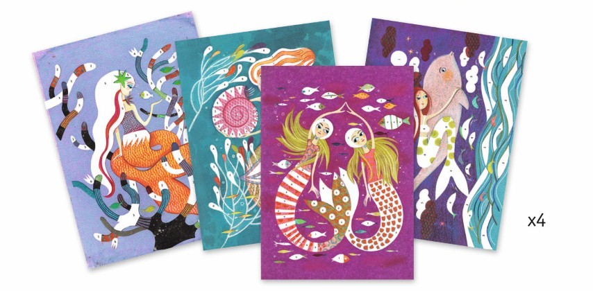 -4 cuadros con cautivadoras sirenas que se iluminan con purpurina de colores. El niño coloca su cuadro en la caja, descubre las zonas adhesivas con la herramienta incluida y aplica los polvos de purpurina siguiendo el código de colores indicado en el folleto. ¡Una vez terminada la actividad, estas maravillosas brillan y asombran a los niños!