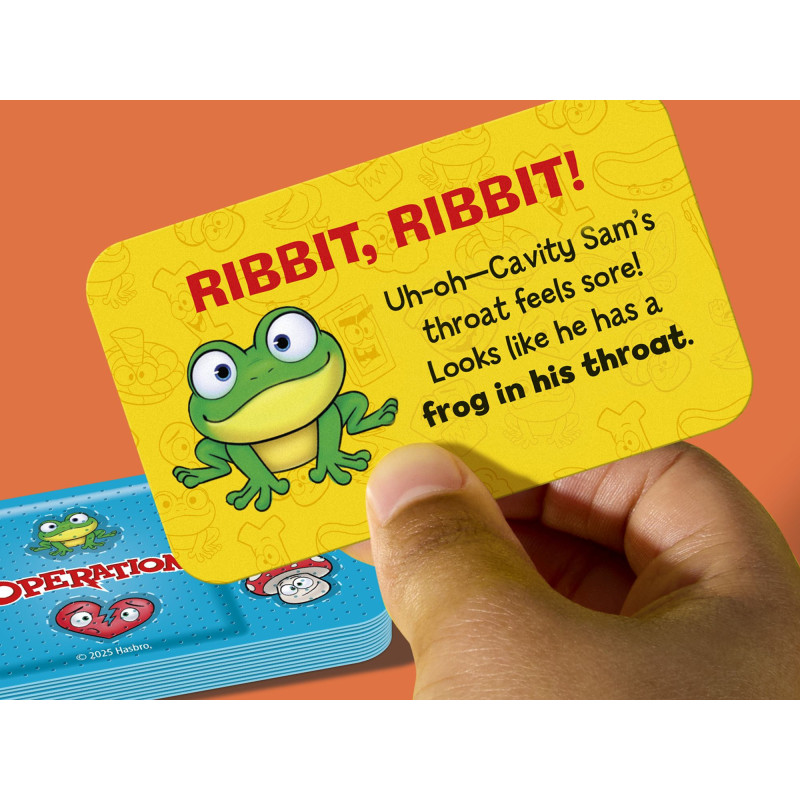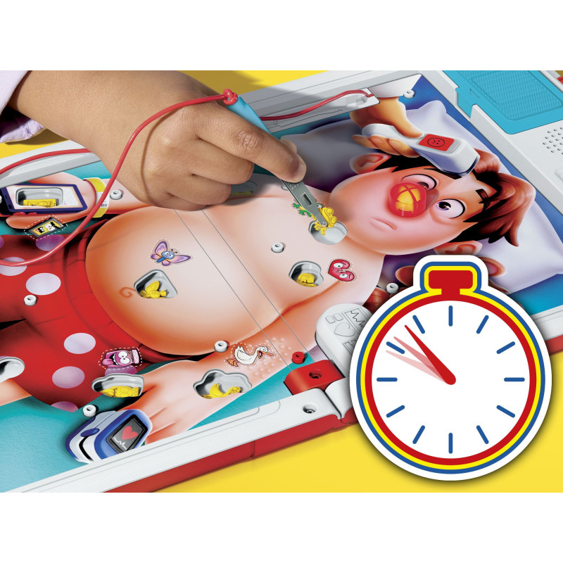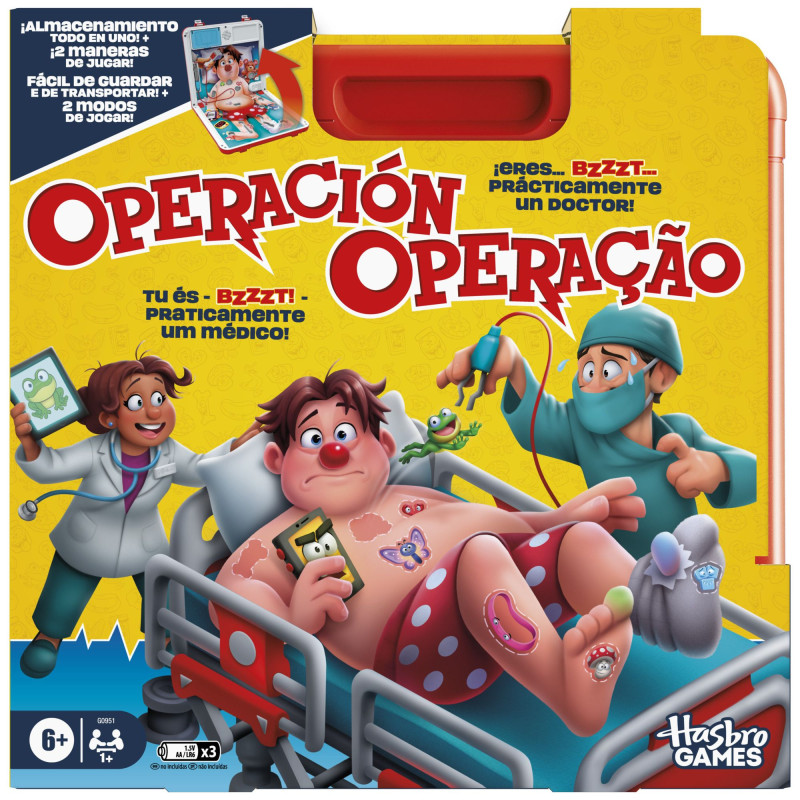¡Eres… BZZZT… prácticamente un doctor! ¡El juego de mesa favorito de los pequeños con emocionantes actualizaciones! En esta edición del juego Operación, elige entre 2 maneras de jugar: juego clásico con el modo Hospital o un intenso y veloz juego en el modo Urgencia. En el modo Hospital, los pequeños doctores cogen cartas Curita para descubrir disparatadas enfermedades. El suspenso aumenta mientras los pequeños intentan mantener sus manos firmes al operar a Sam, pero cuidado… ¡BZZZT! ¡su nariz roja se ilumina! En el modo Urgencia, los niños deberán competir contra el reloj para extraer todas las piezas de enfermedad que puedan antes de que se acabe el tiempo. ¡Pero ten cuidado! ¡Si las pinzas tocan los lados, Sam eructará, gritará y emitirá otros cómicos sonidos que harán reír a los pequeños a carcajadas! En ambos modos, el que extraiga más piezas de enfermedad gana, y cura al paciente. Este adorable juego viene en un estuche todo en uno con un compartimiento para guardar las piezas, por lo que es un fantástico juego de viaje para toda ocasión.