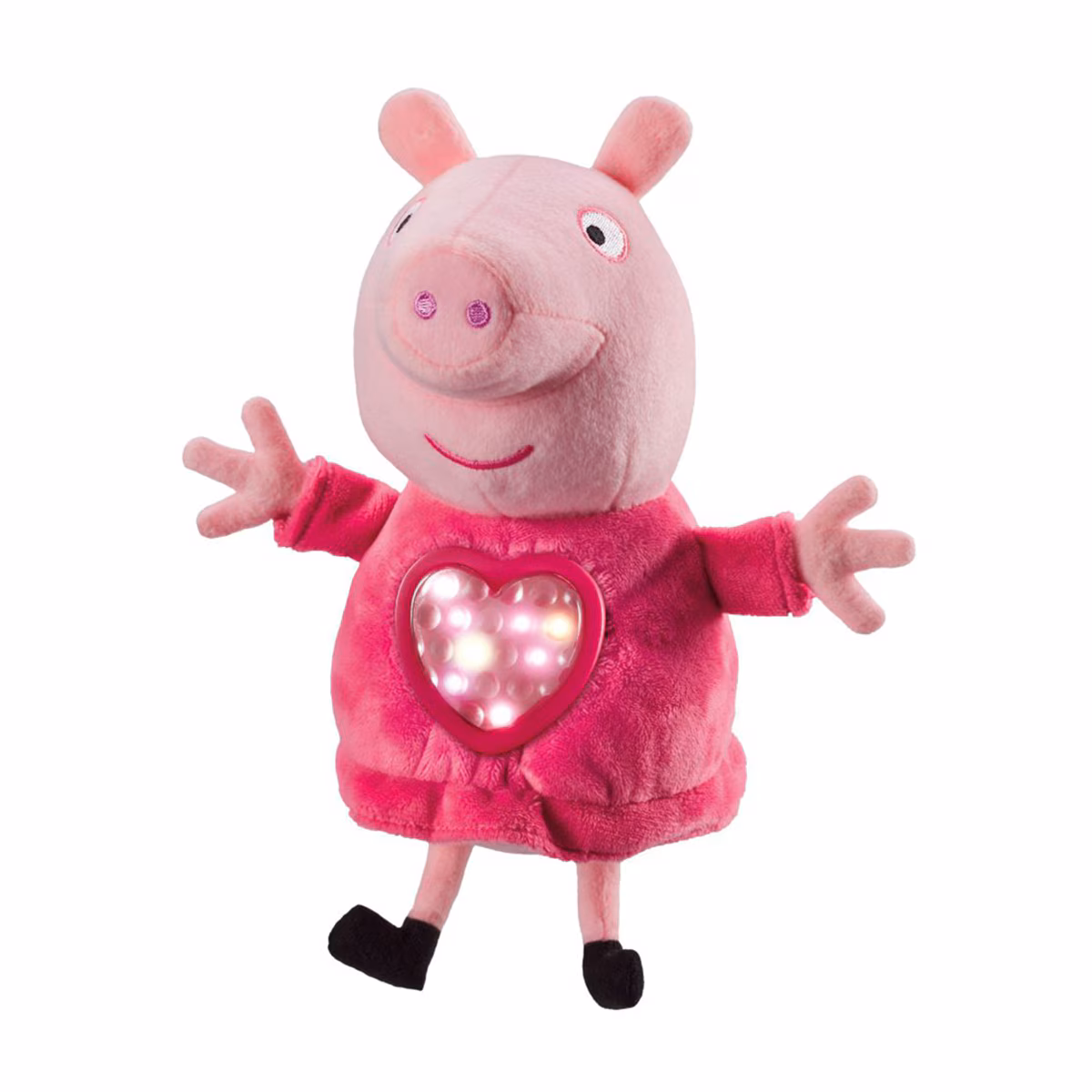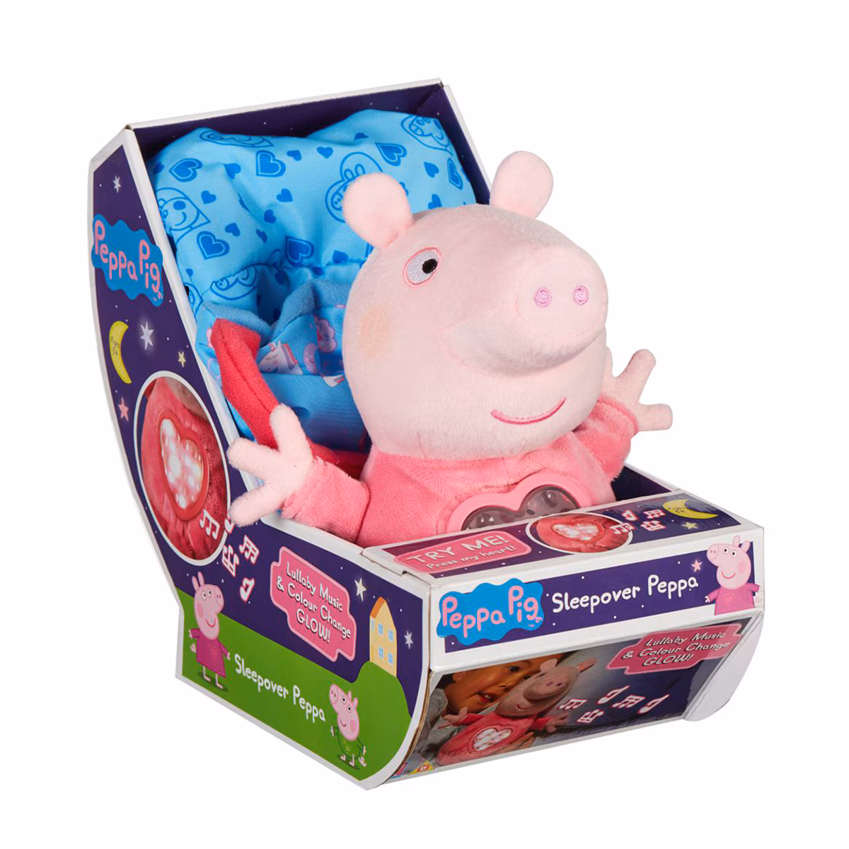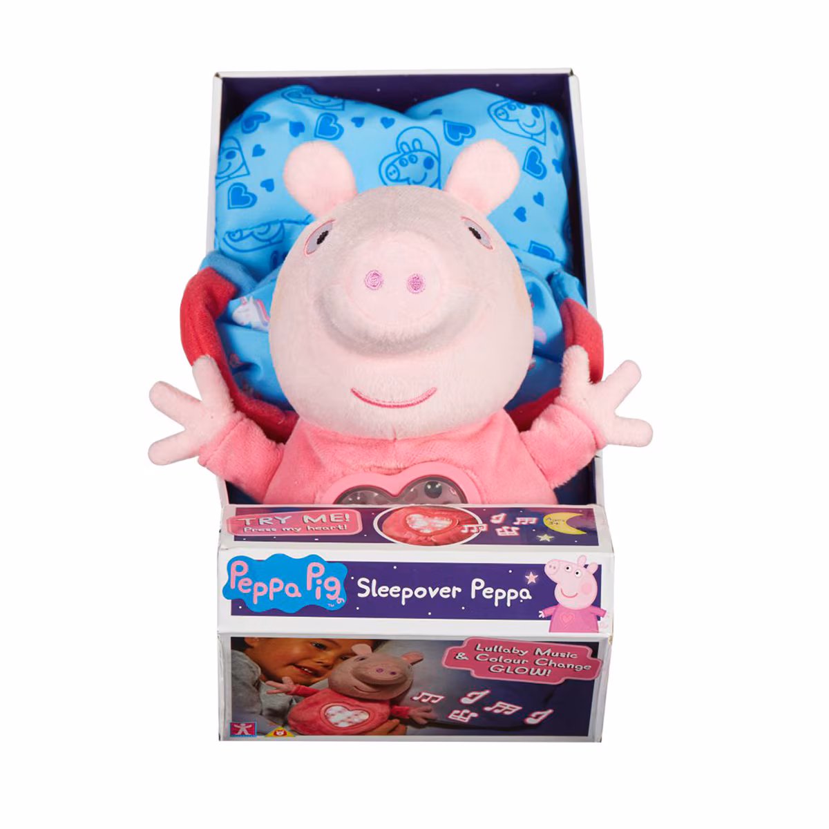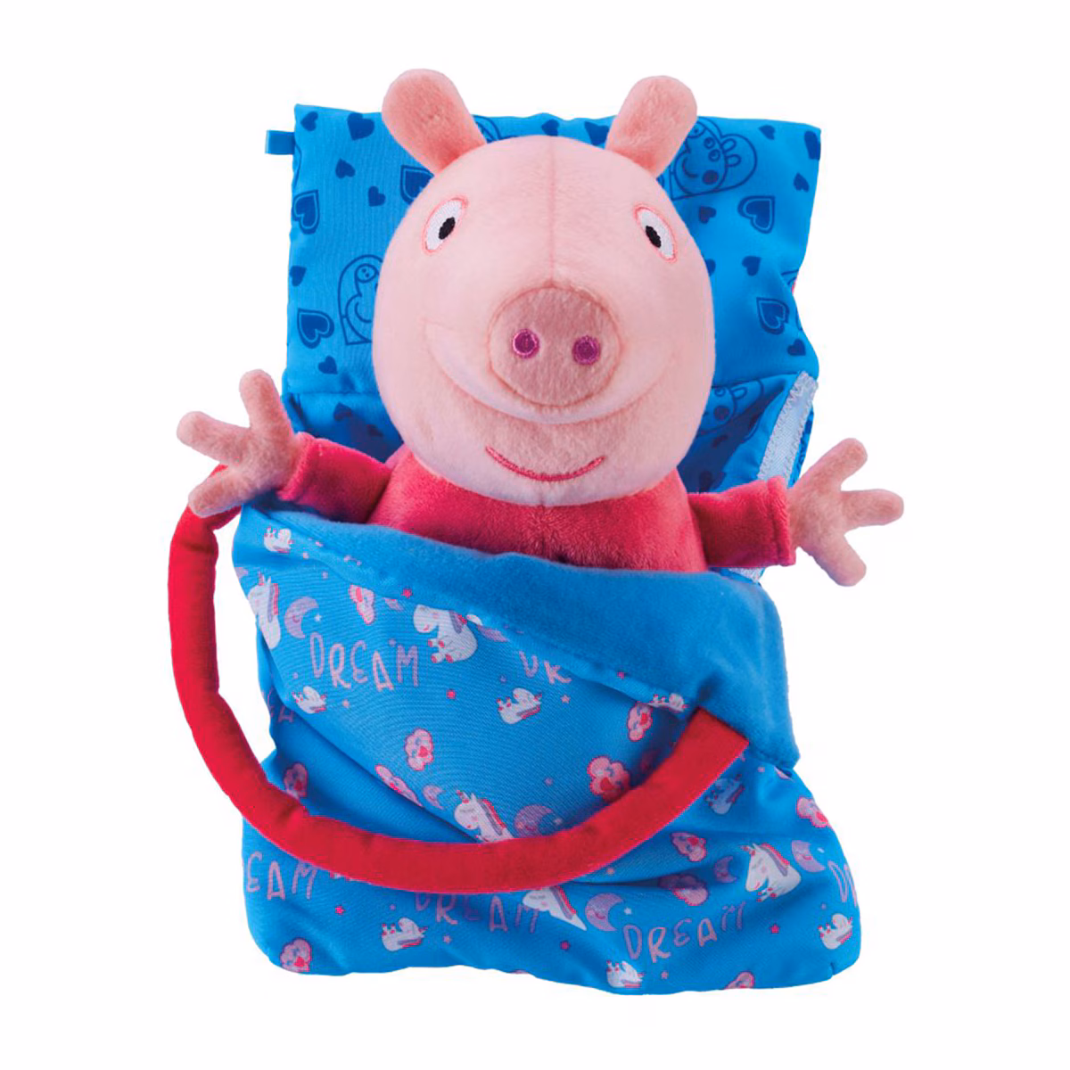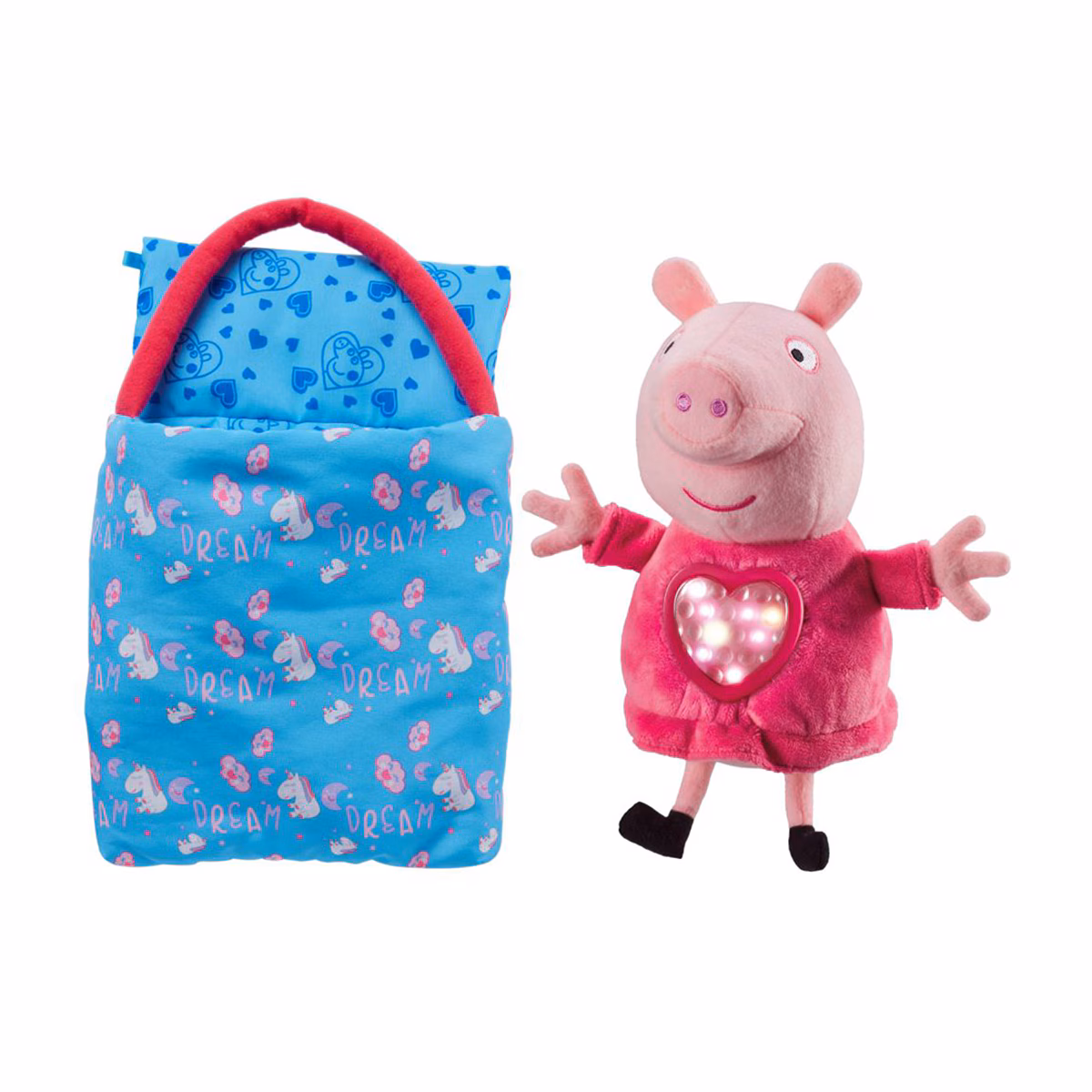 Peluche Peppa Pig con saco de dormir que se dobla y se convierte en una bolsa de transporte. Al presionar el corazón este se ilumina y suenan nanas.